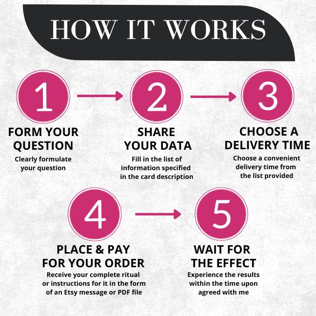 ☑️ Your ritual will be delivered to you as a digital file (detailed PDF-file) within 1 hour or 1 day of purchase, depending on the timeframe you choose. If you have trouble downloading the file, I will provide you with alternative delivery methods, such as screenshots, a new download link, or a personal message.