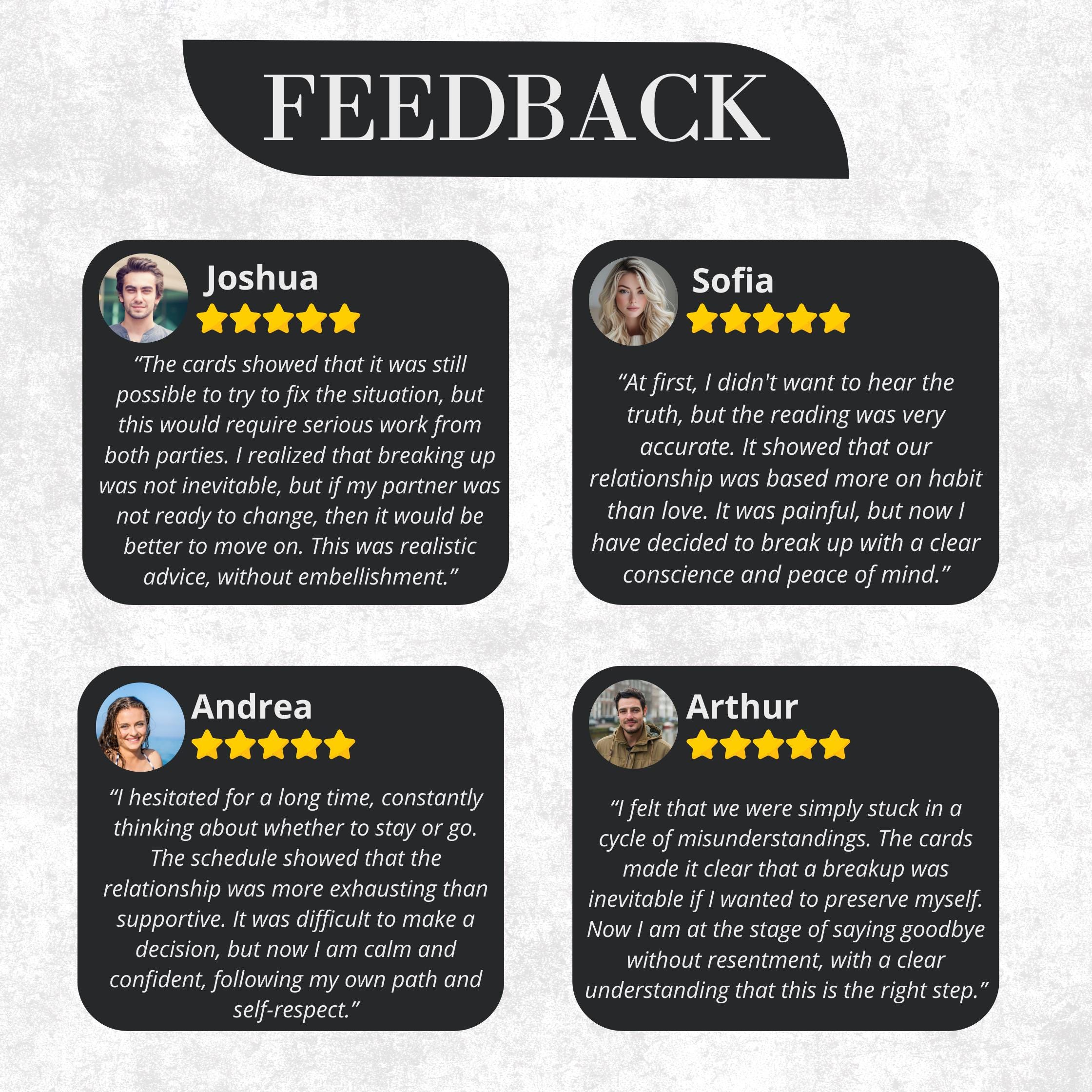 🌟 After the Ex Reading, you will gain a clear understanding of the current emotional situation, see what feelings still remain between you and your ex, what blocks are affecting a possible reconciliation or breakup, and receive practical guidance for inner healing. The effect of the reading is to provide clarity, emotional relief, and an understanding of how to move forward without unnecessary pain and illusions, whether it is letting go of the relationship, restoring the connection, or preparing for a possible future breakup.