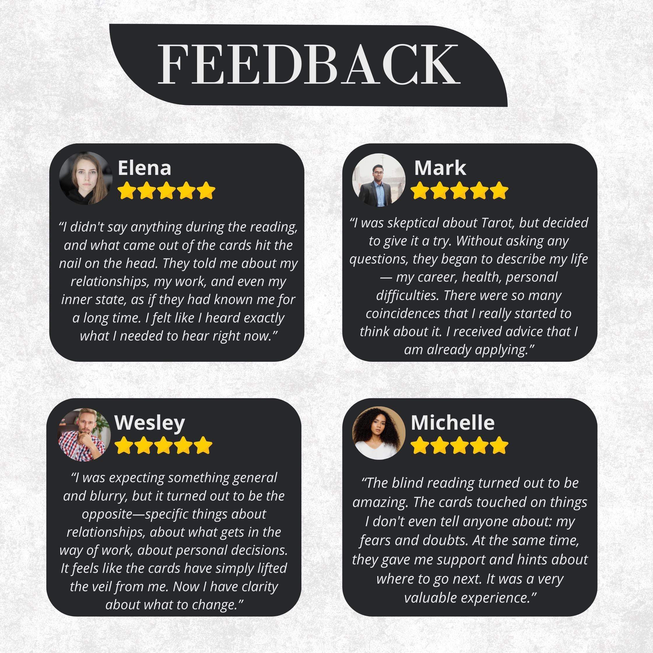 My Tarot readings are not statements of absolute truth, but rather visions and hints for the present moment. The cards show the possible direction of events, but the future is not set in stone. Any decisions or actions you take can change the course of events.