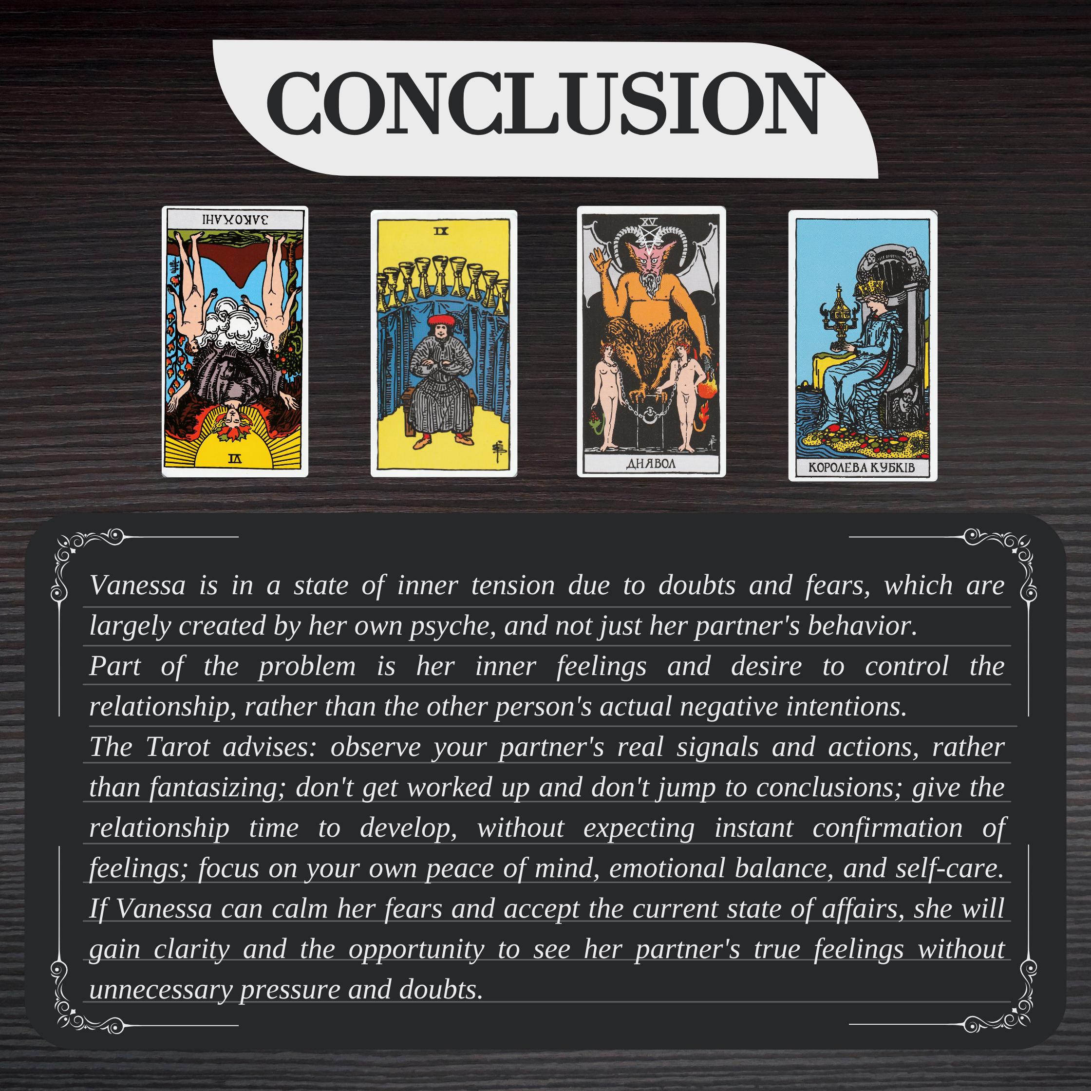 ☑️ Support in decision-making. This reading helps you consciously understand your partner's feelings, see the true state of the relationship, and choose: to preserve love, restore it, or let it go with dignity.