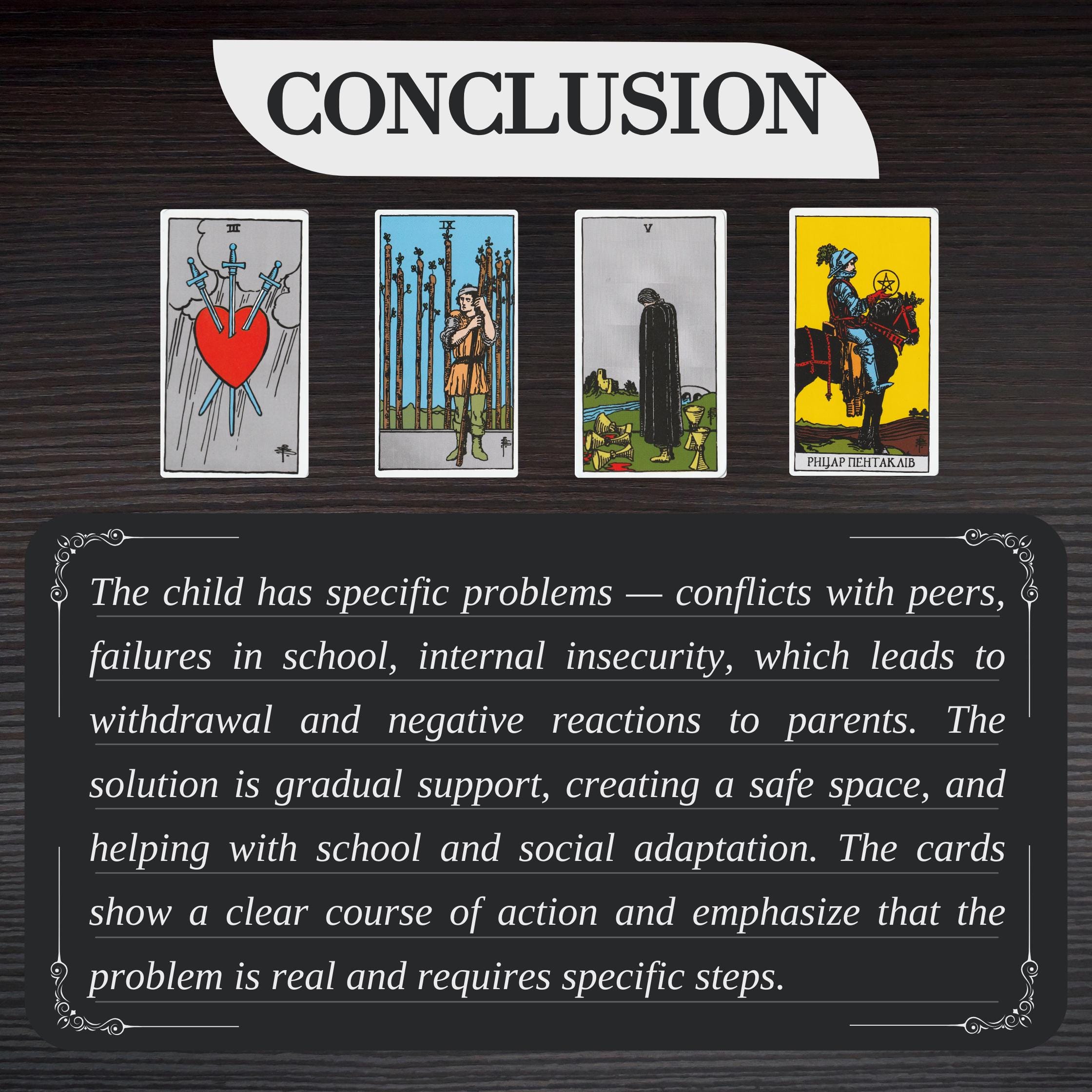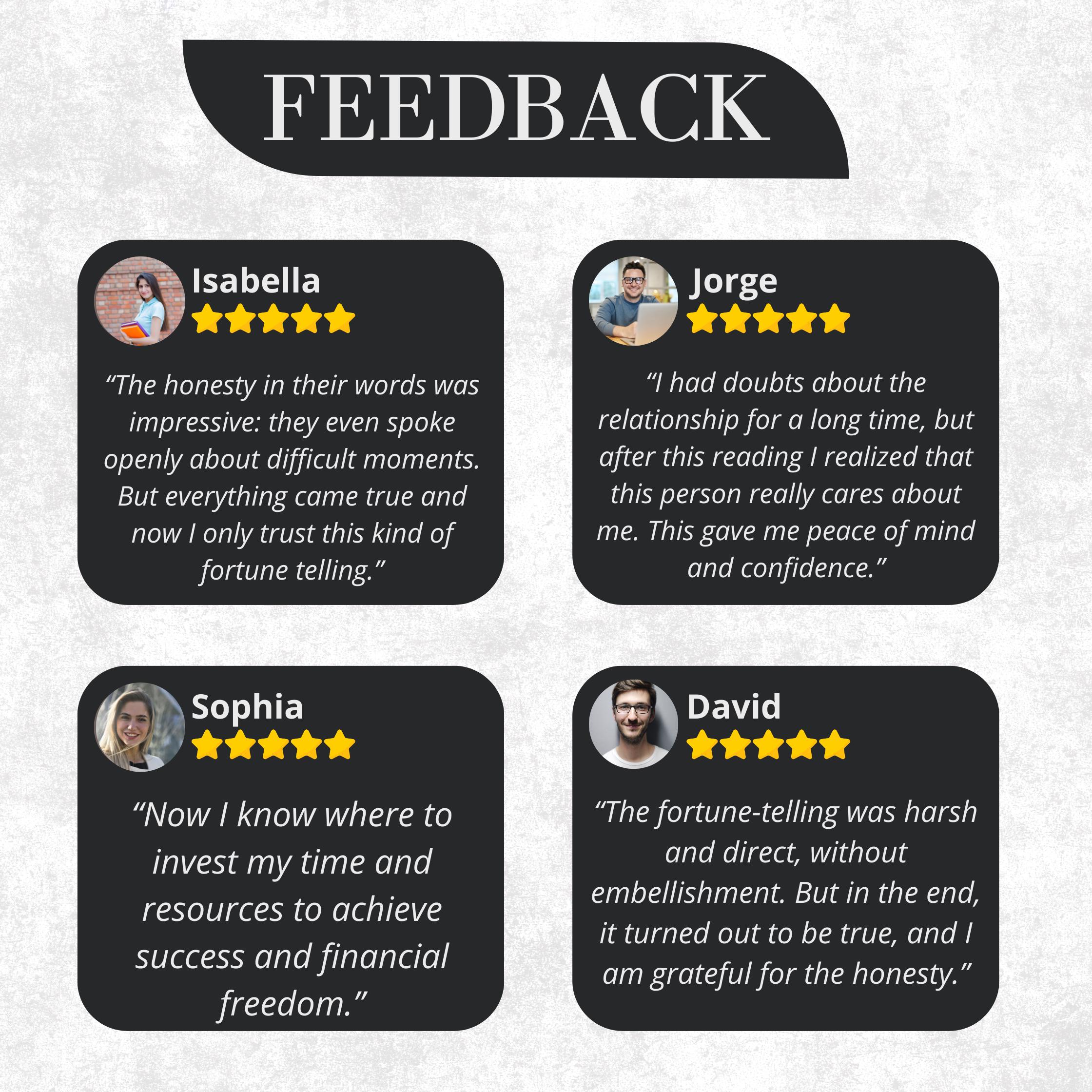 My Tarot readings are not statements of absolute truth, but rather visions and hints for the present moment. The cards show the possible direction of events, but the future is not set in stone. Any decisions or actions you take can change the course of events.