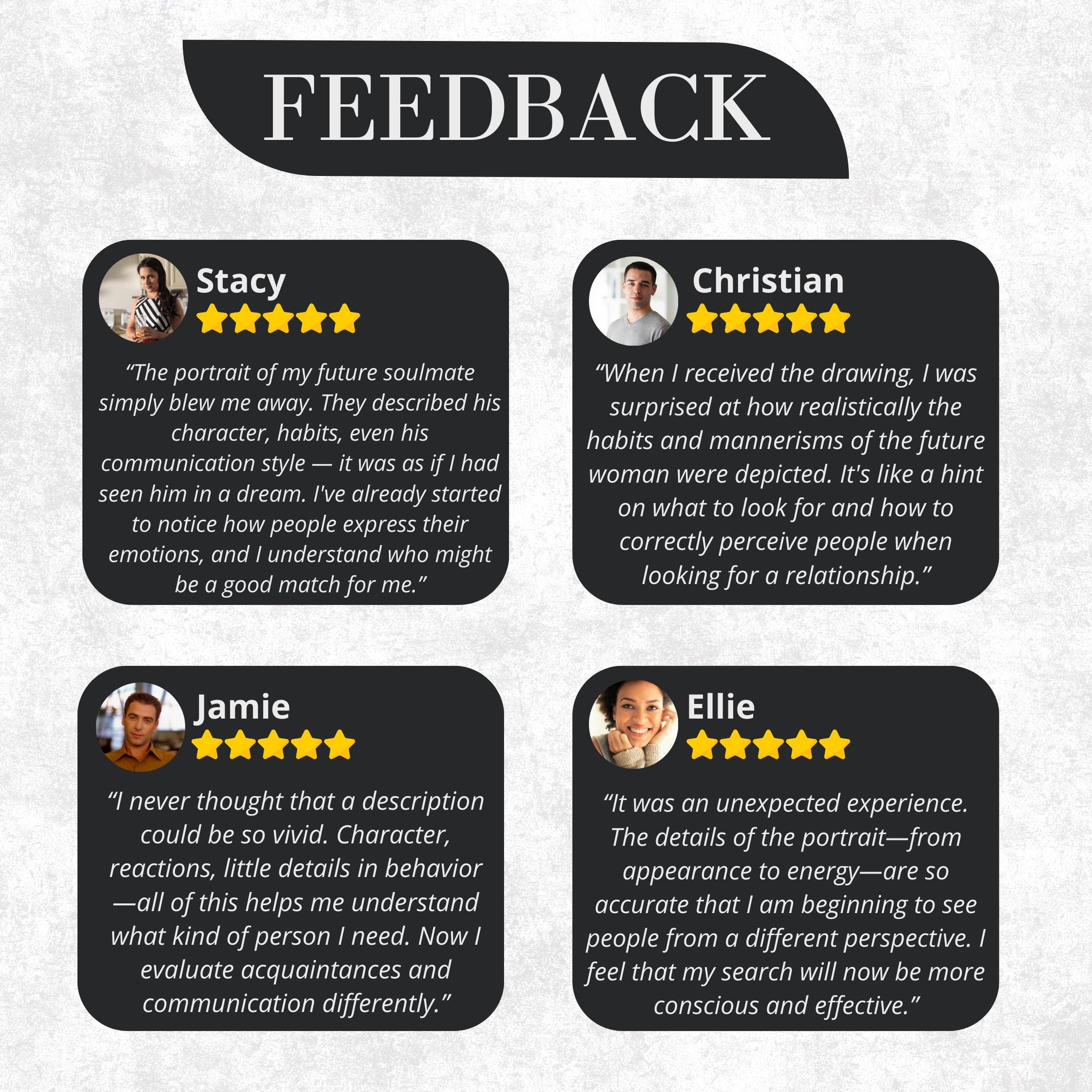 ✨ Want to learn about your future partner? Our Soulmate Drawing and personalized Tarot card reading offer you a unique and powerful insight into your romantic destiny. As an experienced Tarot reader, I not only create a stunning Soulmate Sketch of your future life partner, but also provide deep intuitive insights that will open the way to true love.