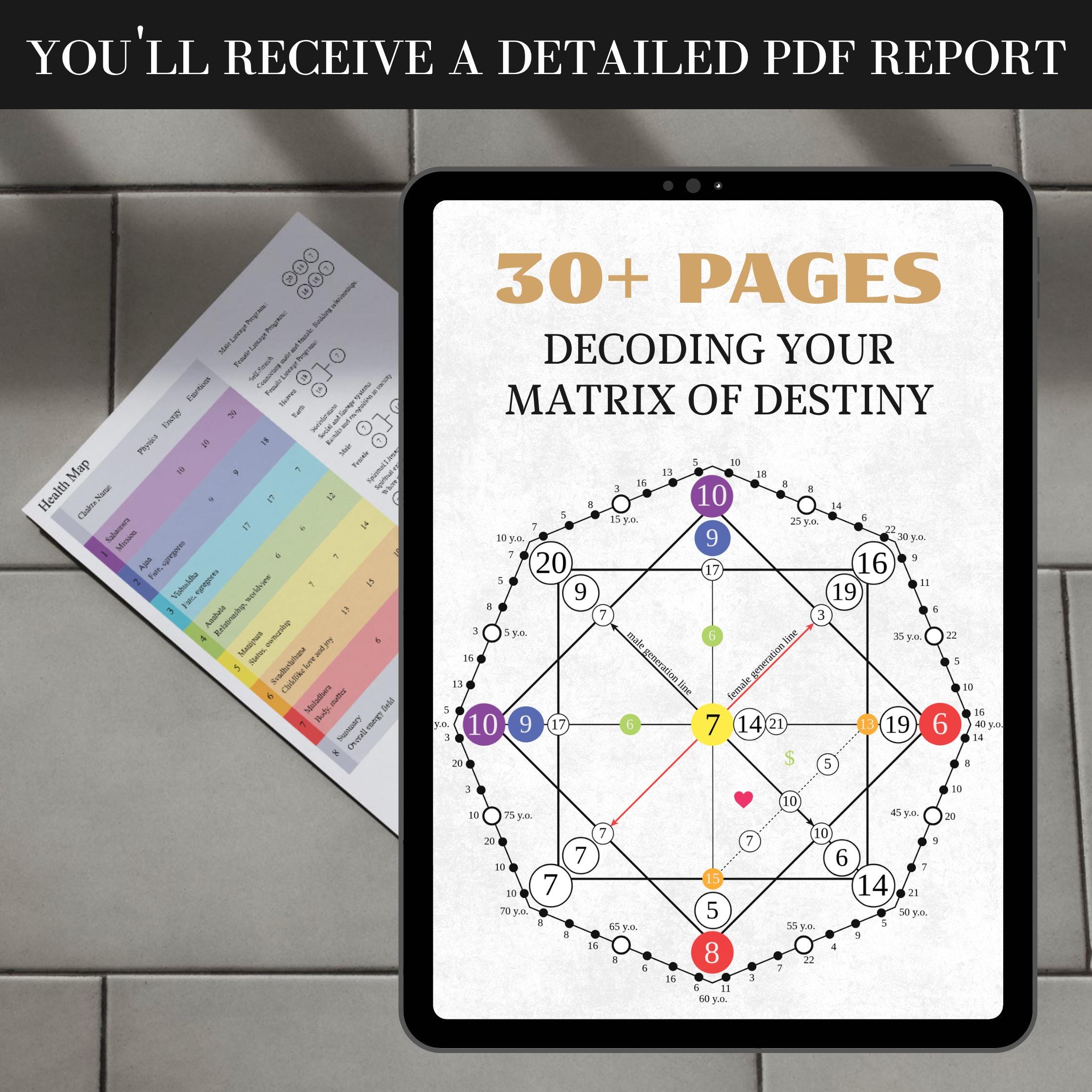 A beautiful PDF file with a visual Matrix of Destiny — a well-designed, easy-to-read, and easy-to-use document that stays with you forever.